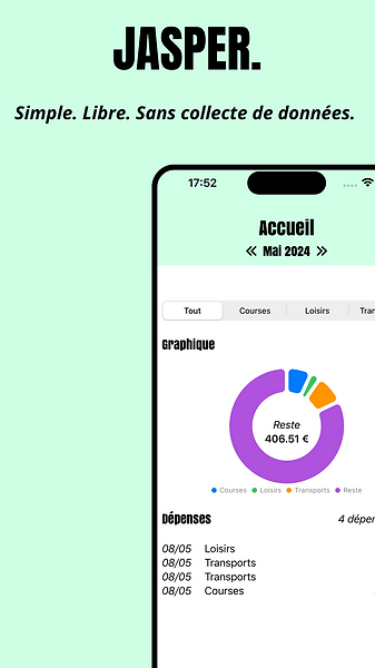 Créez vos propres catégories, ajoutez simplement vos dépenses, et choisissez vous-même quand vous changez de période.